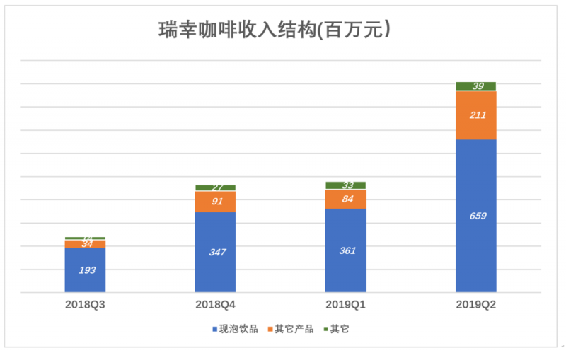 2019年Q2,新泡饮品收入6.59亿、同比增长556%;其它产品(轻食等)收入2.11亿、同比增长2395%;其它收入(主要是外送费)3910万元、同比增长212%;季度总营收9.09亿、同比增长648%。