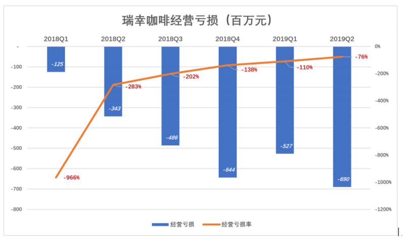 2019年Q2,瑞幸经营亏损达到创纪录的6.9亿,但亏损率已收窄至76%。