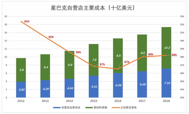 上述计算中没有扣除折旧及管理成本。以2018年为例,折旧、管理成本分别为12.5亿美元和17.5亿美元。折旧自然要摊到自营门店,仅此一项就占到自营收入的6.3%。管理自营的工作量比管理加盟店多(或许自营更容易管理,但工作量摆在那里),假设管理成本的90%摊到自营门店,又花掉自营收入的8%。照此计算,2018年自营店折旧、管理费两项合占收入的14.3%,而毛利润率只有12%。星爸爸自营店东西那么贵,居然是亏本的。