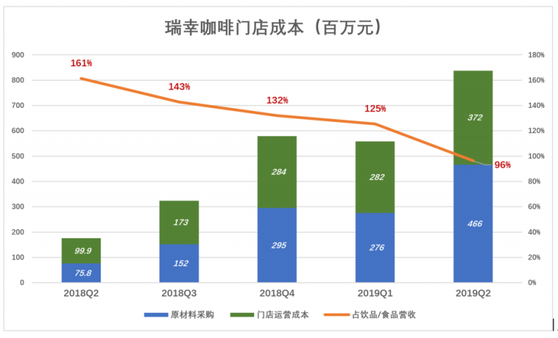 2019年Q2,瑞幸咖啡门店运营成本为3.72亿、占饮食销售收入的47.2%,比星巴克高10.8个百分点,差距主要在这里。