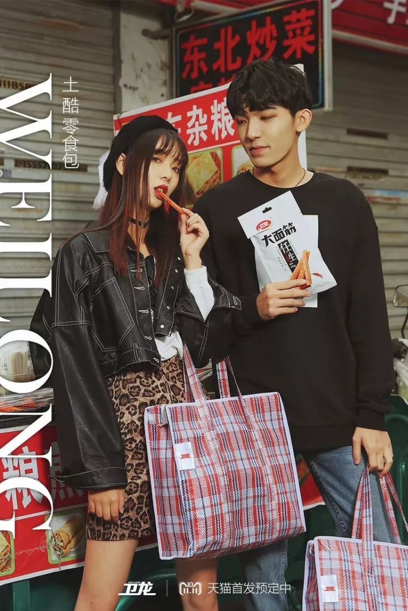 去年双十一之际,卫龙将潮流推向极致,设计出一款宛若蛇皮袋子的土酷零食包。穿搭时髦的男女,手挎“蛇皮袋”,嘴衔卫龙大面筋辣条,画风清奇。