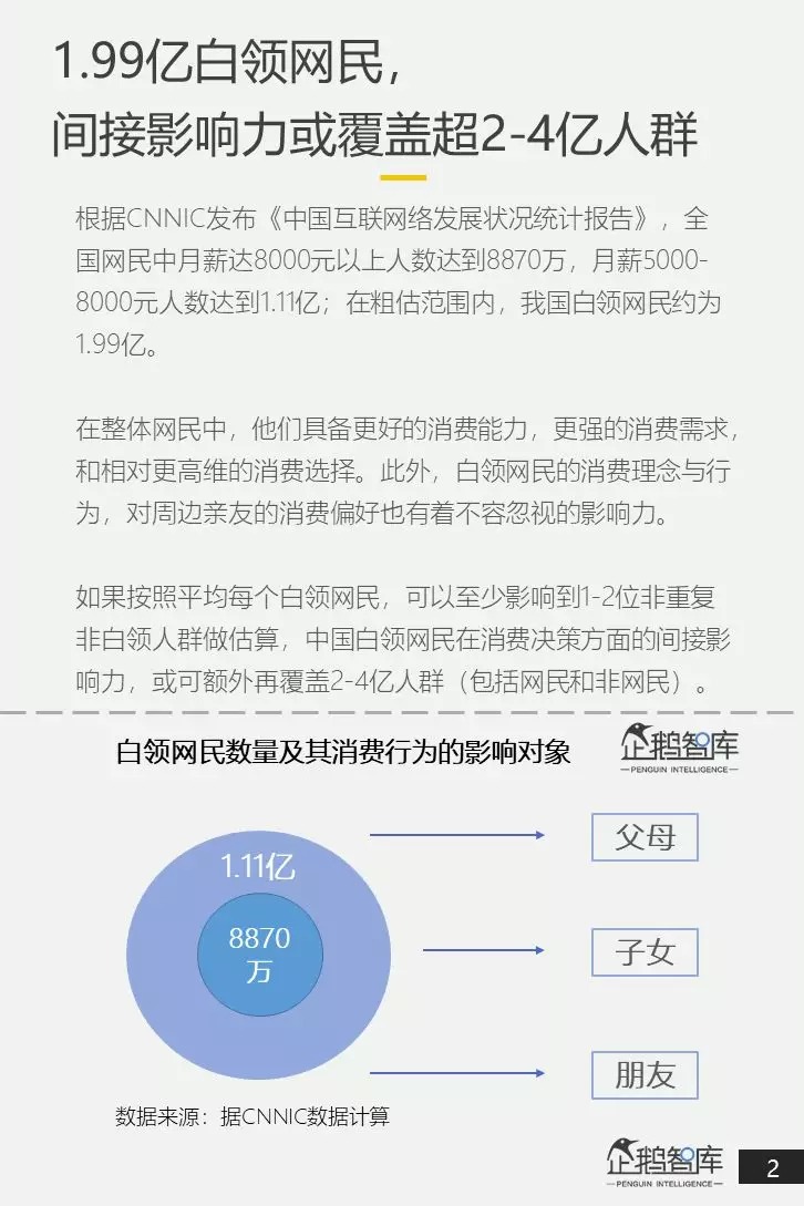 如果按照平均每个白领网民,可以至少影响到1-2位非重复非白领人群做估算,中国白领网民在消费决策方面的间接影响力,或可额外再覆盖2-4亿人群(包括网民和非网民)。