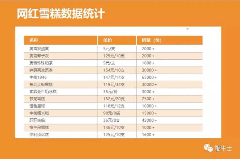鞭牛士对目前部分网红雪糕的淘宝销量做了统计。从统计中可以看出,网红雪糕价格偏高,比普通雪糕高出两倍价格左右,但销量却十分可观。