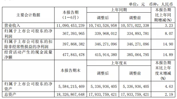 财报显示,2019 年上半年,光明乳业营业总收入 110.90 亿元,同比上升 3.23%;净利润 5.11 亿元,同比上 升 11.04%;归属于上市公司股东的净利润 3.67 亿元,同比上升 8.07%;净资产收益率 6.64%,同 比上升 0.61 个百分点。