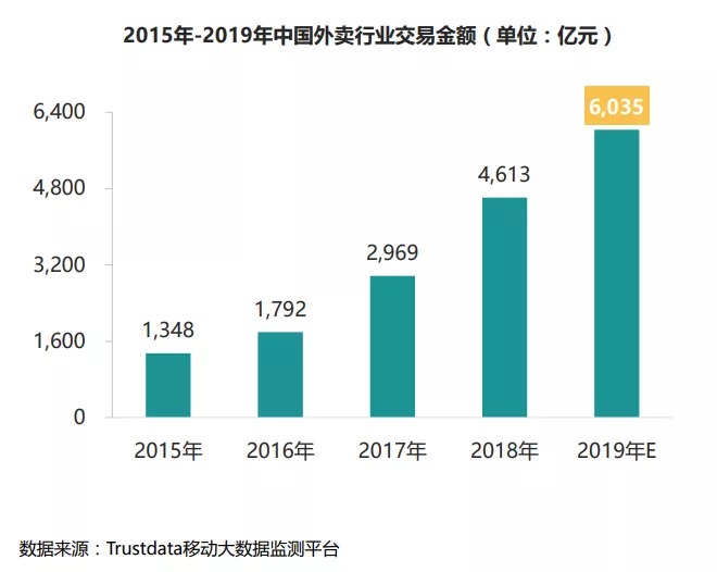 根据Trustdata移动大数据监测显示,2015年我国的外卖行业交易金额为1348亿元,到了2018年这一数字为4613亿元,仅仅三年时间就增长了2.42倍。并且预计,到2019年底,我国外卖行业交易金额将突破6000亿元,达到6035亿元。