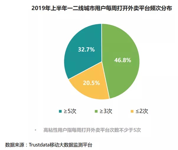 根据《2019年上半年中国外卖行业发展分析报告》显示,在一二线城市中,今年上半年用户每周打开外卖平台频次“≥5次”的占比为32.7%,“≤2次”的占比最小仅为20.5%,可以说外卖平台的用户粘性比较高。而且,三线及以下城市中也得出了相同的观点,那就是用户的使用频次显著增加,粘性显著在增强。