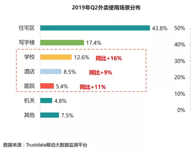 在今年第二季度的外卖使用场景中,尽管住宅区的占比最高,但是学校、酒店、医院的占比也显著增加,增幅分别为19%、9%和11%。