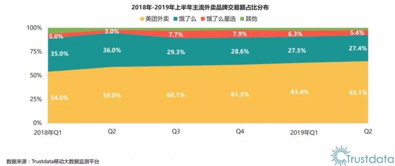 该报告显示,2019年第二季度美团外卖的市场份额为65.1%,较去年同期增长近6个百分点,饿了么的市场份额则萎缩至不足3成。