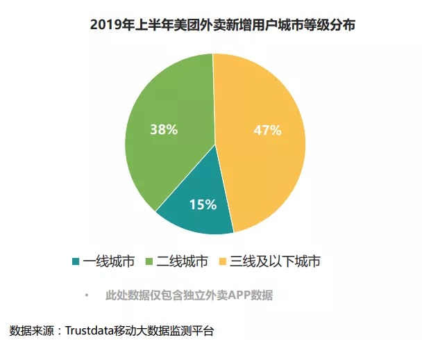今年上半年美团新增的用户里,有47%来自“下沉市场”,即三线及以下城市;一线城市的新增用户占比最低,仅为15%。饿了么的新增用户与美团大体相似。