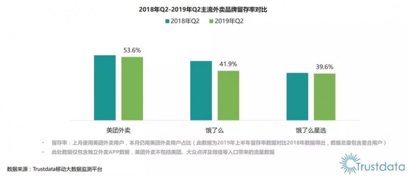 Trustdata监测的数据显示,美团外卖的用户留存率为53.6%,与去年同期大体持平,饿了么的用户留存率下降明显,跌至了41.9%。