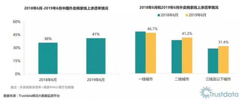 从宏观的角度而言,截止2019年6月我国外卖商家的渗透率为41%,比去年同期提高近5个百分点。