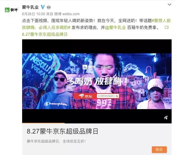 不得不说,蒙牛这种先以病毒视频预热,紧接着带话题造势的玩法,很好地与消费者建立了一站式的情感互动环节,将这种social玩法形成了一种营销闭环,更好地为蒙牛京东超品日做好流量转化的准备。