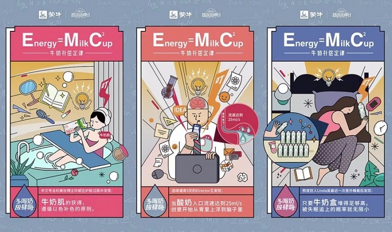 在牛奶补充定律上,蒙牛还建立了一个趣味的方程式:Energy=MilkCup²(E:放肆嗨的能量,M:牛奶,C的平方:杯数,表达“多喝奶,放肆嗨”的意思。)