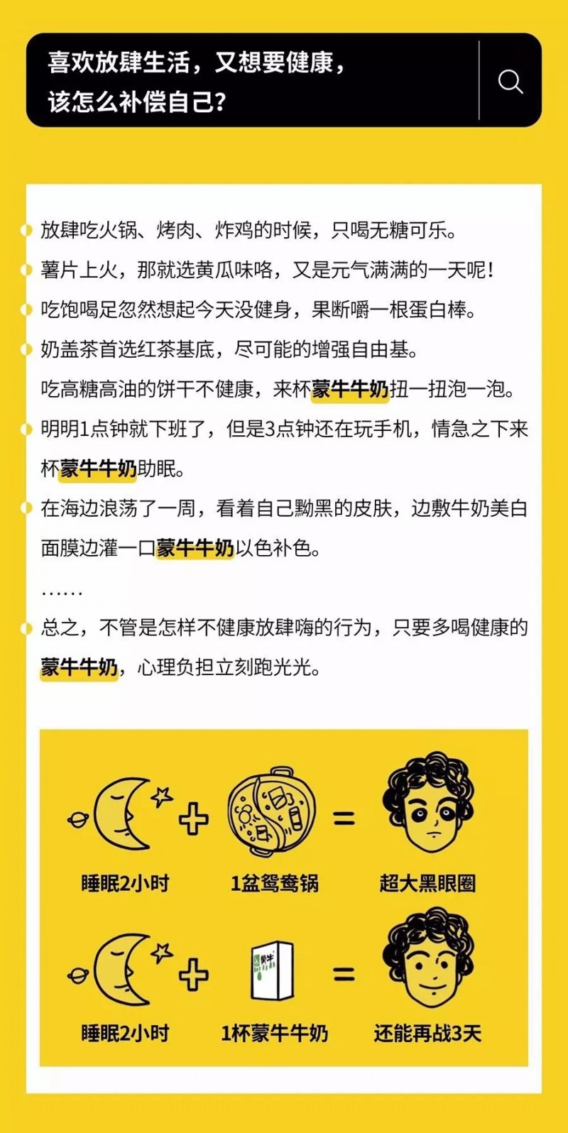 补偿式养生的风靡,在年轻人看来,是一种自嘲的生活方式;但是在蒙牛眼中,是一次与消费者进行对话的机会。