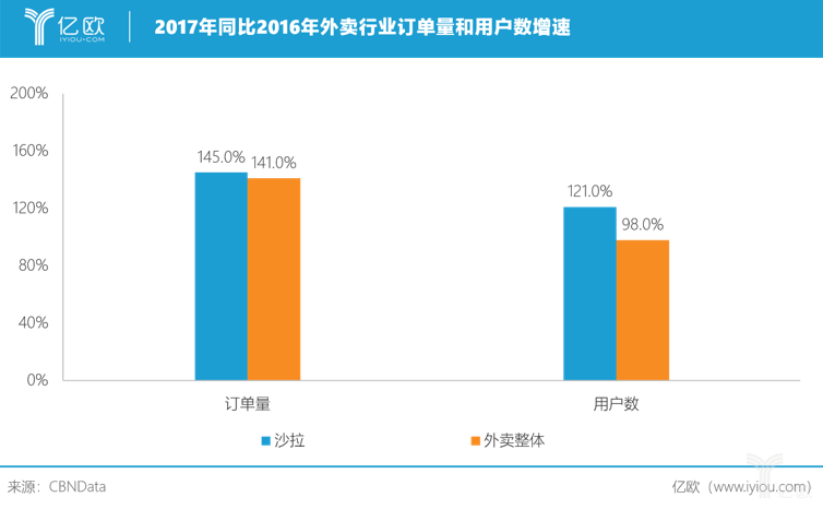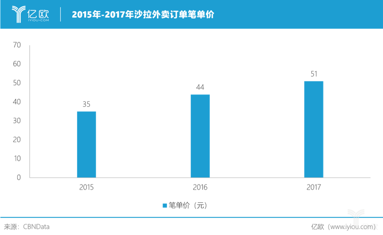 轻食餐厅层出不穷,而消费者在外卖种类的选择上也表现出对轻食的青睐。2017年饿了么平台上的外卖订单与2016年相比,沙拉订单量增速高于整体订单量增速,把沙拉作为外卖选择的用户数有明显增加。连续三年的统计数据显示,用户的沙拉外卖订单笔单价持续增长,2017年达到51元。