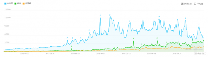 内推外促的多种因素叠加,牛油果在不到1年的时间里从在中国无人知晓的水果直接蹿升至“新中产”、“伪中产”、“时尚弄潮儿”群体的一致心头好。很快,牛油果成功进军时尚界、美妆界,所到之处无人能躲过,一时风头无两。2018年,中国的牛油果进口量同比增长342%,达4.39万吨。在2011年,这个数字还仅仅是21.8吨。百度指数上陡升的曲线也昭示出不想被落下的新生代消费者们如何在搜索框疯狂敲击。