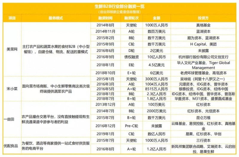 目前比较有代表性的公司有,针对中小餐饮商户的美菜网、美团快驴;服务于农贸市场及中小零售商的宋小菜;由传统企业裂变而来的供应链公司,如彩食鲜(永辉)、蜀海(海底捞),主要服务于大B客户;还有很多传统做批发生意出身的玩家,虽然没有资本的关注,却靠着多年积累的经验和人脉,在某一特定区域崭露头角。各家正处在快速布局当中,格局尚未形成。
