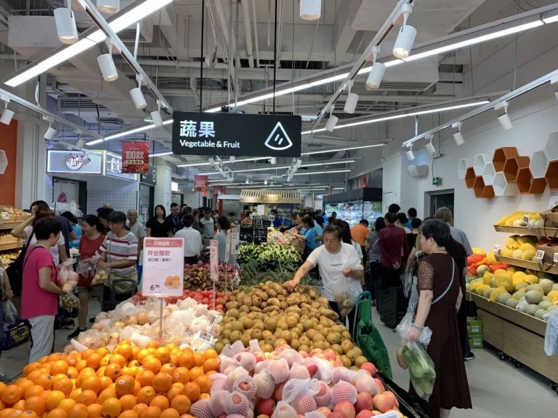 超市中心区域是一个不太“盒马”的摆放散称果蔬的台子。