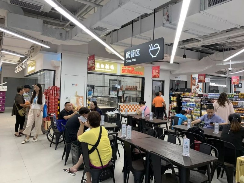 盒马鲜生门店中那条看上去科技感很强的悬挂链在这里消失了。有人在线下单,拣货员是将打包好的订单送到后面的仓库区域,而配送半径也从3公里缩小到1.5公里。店内设置了一个小型餐饮制作区,只有一个小窗口,就餐区只能容纳20多位消费者同时就餐。
