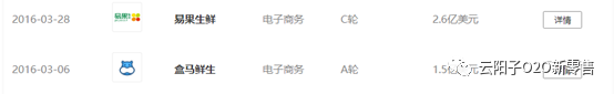 易果生鲜是生鲜电商模式,盒马是生鲜O2O模式,两者在商业模式设计上不一样。有意思的是,盒马A轮1.5亿美金与易果生鲜C轮2.6亿美金是在同一时期融资的。