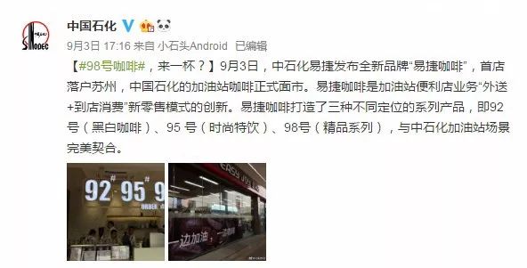 从中国石化微博9月3日发布的信息了解到,中石化旗下的易捷便利店推出了自己的咖啡品牌“易捷咖啡”,首店落户苏州,中国石化的加油站咖啡正式亮相!