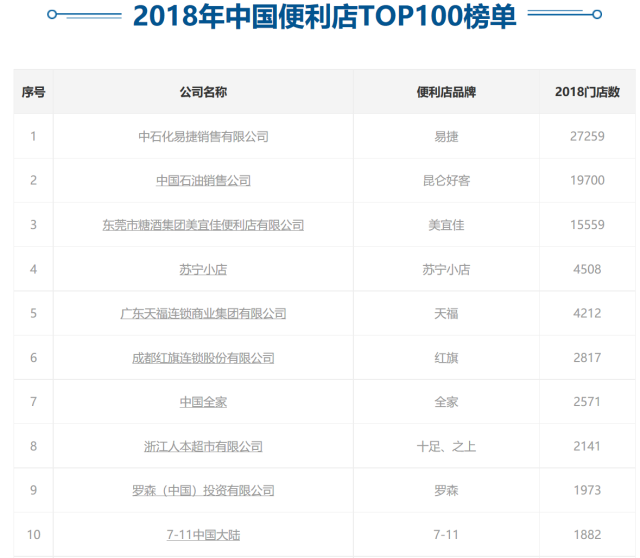 易捷便利店是中国便利店数量最多的品牌,据中国连锁经营协会发布的2018年中国便利店TOP100榜单显示,中石化易捷在全国有27259家门店,大大领先于中国石油旗下的昆仑好客19700家门店,起家于广东的美宜佳是第三名,门店数为15559家,即使第三也远远拉开了与第四名的差距。排名第四的苏宁小店为4508家。而都市人群熟悉的711和全家,仅仅分别位列第7和第10名。