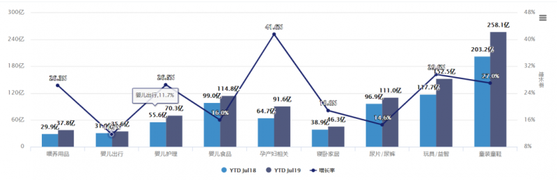居民消费能力不断上升,使家庭能够分配更多的支出在新生儿上,同时科学育儿观念逐渐形成,多元化消费需求愈加明显。从数据上看,母婴九大类目都得到了不同程度的增长,其中婴儿食品虽然在线上规模上还保持着第三的地位,但热度却持续降低,2018年全年婴儿食品热度最高,增长速度最快,达37.8%。但截至2019年7月,孕产妇相关为本期最热类目,婴儿食品仅为16%,仅排在第七位。