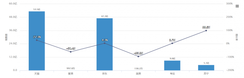 从子品类的线上平台分布情况来看,与2018年不同的是,2019年四个子品类的线上最大平台都是天猫,其中婴儿奶粉,天猫所占市场份额与2018年相比,已超越京东,略高于天猫,占到45.2%;婴儿辅食,天猫所占份额也有所提升,比2018年的49%已提高至54.8%。