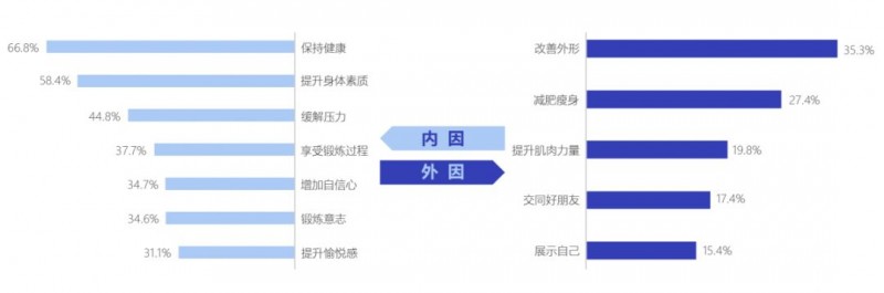 运动健身人群坚持运动的内在原因主要是保持健康、提升身体素质和缓解压力;外在原因则表现在改善外形、减肥瘦身。