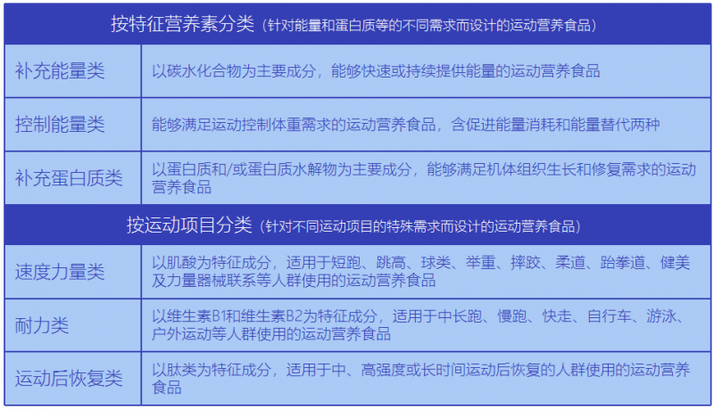 据GB 24154-2015《运动营养食品通则》,现有运动营养食品可按照营养素、运动项目进行分类: