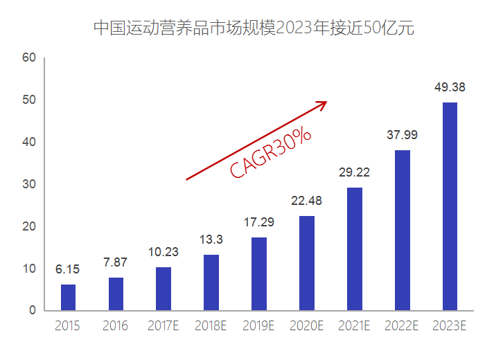 相较于发展较早的北美地区而言,中国运动营养品产业仍处于初级阶段向快速发展阶段迈进过程中,但是中国运动营养食品市场展现出了巨大的发展潜力。据Euromonitor统计预测,2016年我国运动营养品市场规模为7.87亿元,未来五年将保持在30%左右增速,2020年有望超过22亿元,2023年接近50亿元。▼