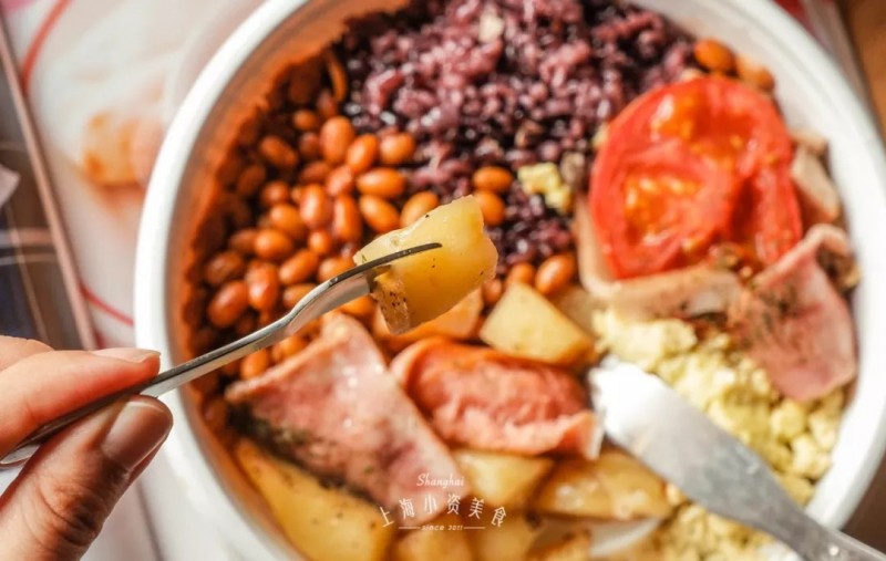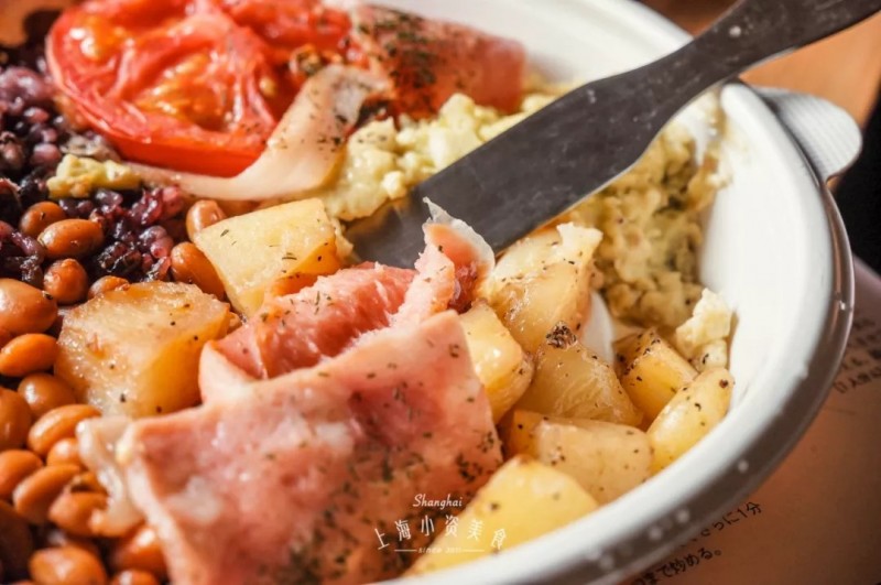打开一看,食材还是很丰盛的:不算嫩滑的炒蛋、酥软的土豆、鲜嫩的培根、软糯的谷物饭,甜甜的豆子......按便利店出品的标准算是不错啦!