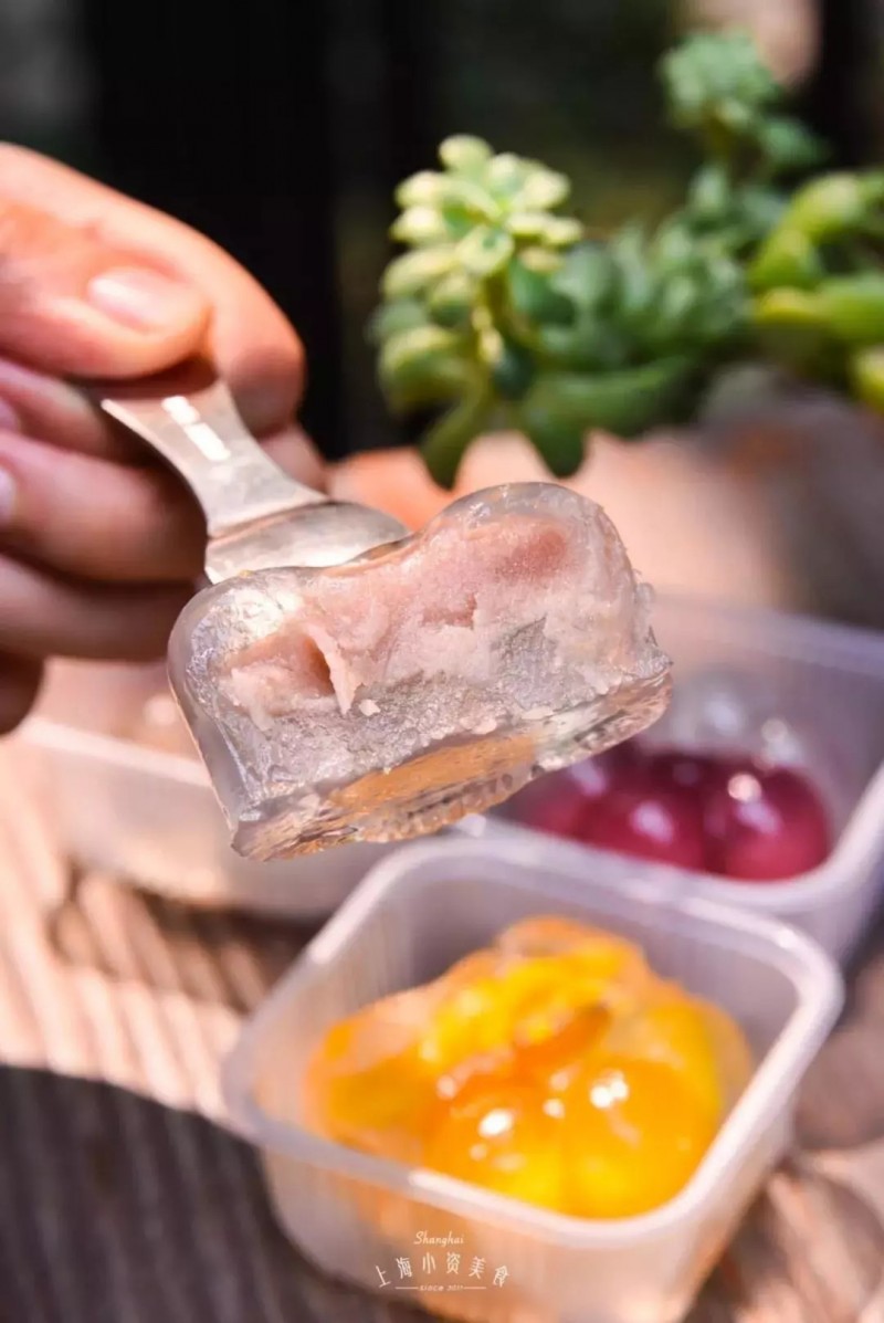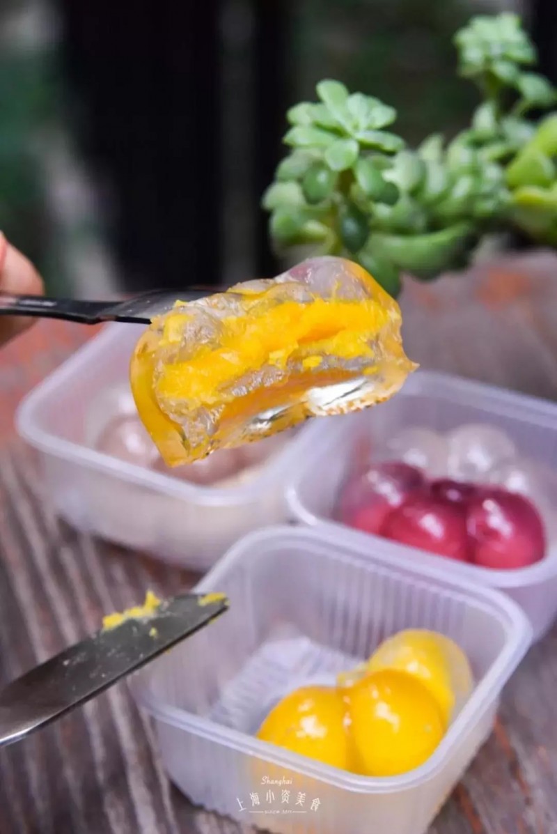 藏透亮的啫喱外皮滑溜溜的,嚼起来有点在吃QQ糖,内馅的奶黄泥和香芋泥,在融化后会变得很酥润细腻,味道也很柔和。相比之下,红酒蔓越莓就显得刚烈了很多,夹杂着淘气的果酸味,至于红酒味么,无。