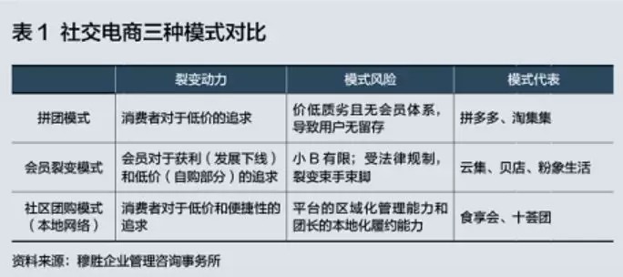 目前来看,社交电商主要有三种模式:拼团模式、会员裂变模式和社区团购模式(表1)。