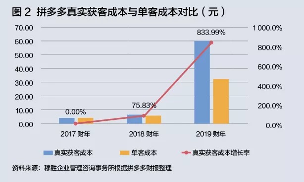 以成长最快的拼多多为例。我们发现,这种裂变模式里的用户和平台有交易却无黏性,后期获客依然需要靠新的投放。根据我们的统计口径 ,相对阿里、京东,拼多多的真实获客成本飞速上涨,且有继续加速的趋势。2018财年,拼多多的该项数据涨幅为75.83%(图2),而阿里和京东分别为2.46%和35.77%。到了2019年财年,拼多多的该项数据则暴涨833.99%,而阿里仅上涨29.53%,京东上涨103.47%。即便考虑初期拓展市场需要导流,把这个口径放松到单客成本(老用户可以分摊掉一部分成本),其2019财年的增长也达到485%。如果真的是基于流量黑洞的社交电商,怎么会为流量花费如此巨大?要知道,拼多多还有腾讯的庇护,它就是巨大的流量温室里长出来的物种。