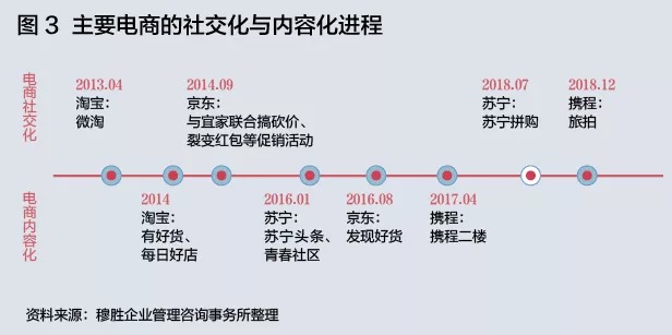 电商内容化的潮流也始于阿里。早在2014年,阿里就在淘宝上线了有好货、每日好店等板块。而后,京东、苏宁,甚至连大众点评、携程等服务类电商也接连跟进(图3)。