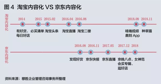 当前,阿里巴巴和京东两大电商巨头已经在内容建设上缠斗了很久。阿里的作风比较激进,而京东似乎反应稍慢,落后了淘宝几个身位(图4)。在“淘宝跑、京东追”的节奏中,两方的内容生态建设已经悄然成形,在图文、视频、直播三大领域内,布局了大大小小的功能模块,源源不绝地向平台内外释放UGC、PGC、OGC内容。