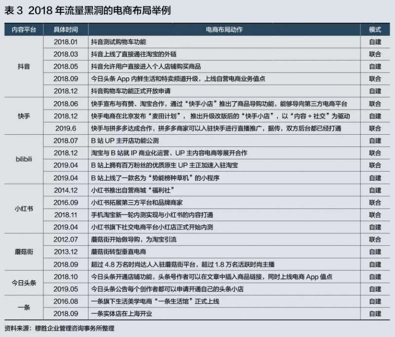 我们统计了主要的流量黑洞走向电商的两类活动(表3):一是与电商合作加载电商模块,我们命名为“联合模式”;二是亲自开展电商业务,我们命名为“自建模式”。可以发现,头部的流量黑洞异常活跃,尤其是在2018年,这类活动出现了井喷,更加证明流量黑洞急于“电商化”。