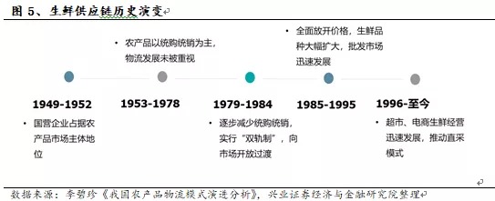 1949-1952年,国营企业占据农产品市场主体地位,农产品匮乏使生鲜跨区域、多品种需求很小。新中国成立之初,国家采取自由购销市场体制。到1952年底,国营商业的商品批发额达批发总额的60%,商品零售额达零售总额的34.4%,国营商业在零售市场占主体地位。由于此时公路、铁路等基础设施差,国家通过集体汇编、图上作业等物流技术,实施农产品运输。由于农产品匮乏,此时消费者还未产生对生鲜更高质量的需求,仅仅在附近区域消费,因此商品采购主要在各区域本产地。
