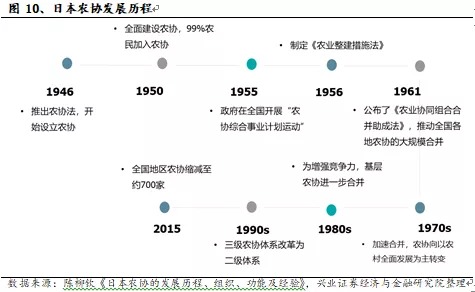 90年代开始,农协三级体系改革为二级体系。为提高效率,日本农协将基层-县-中央三级组织体系改革为基层-中央二级,并将基层农协进行合并。到2015年,从最初的1万余家减少到约700家。