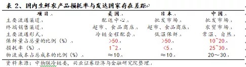 多层运输、装卸,损耗率大幅提高。多级供应链涉及流通环节众多,且由于其“产全国销全国”的市场特点,长途运输不可避免,国内批发零售冷链物流尚不完善,运输环节损耗率较高。产品最终达到消费者手中花费时间较长,国内生鲜农产品25~30%的损耗率相较于美1~2%、日5%非常高。