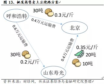 以批发商从内蒙古呼和浩特经销土豆为例,若直接将30吨土豆以0.3元/斤差价批发至距离更近的北京批发市场,则全部售完大致需要5日,扣除运费0.4万元,此趟利润为1.4万元。但若先将土豆运输至距离更远的寿光批发市场,以0.2元/斤售卖20吨获利0.8万元,由于寿光市场吞吐量大,只需1日即可销售20吨,相较北京市场5日才能销售30吨,其风险更低,剩余10吨土豆再配上20吨差价更高的芸豆共同运输至北京批发市场,扣除1万元运输费,这趟距离更远的运输利润为1.8万元,比直接运输至北京的利润高0.4万元。