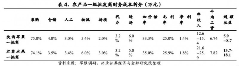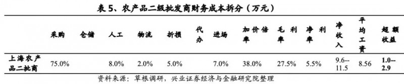 案例一:上海农产品批发市场的二批商。进货渠道主要为江桥批发市场,小部分商品来自产地采购。一般加价倍率为35%。由于经营模式不同于一批商,二批商没有采购时所需的产地仓储设施,由于采购和销售均由自己完成遂没有代办费用,运输费用相对很低,但人工费用和进场费较高。总体来说人工、物流、折损、进场费用占比分别为8.0%、2.0%、5.0%、7.0%,毛利率、净利率为28%、5.5%。虽然盈利能力较一批商强,但由于周转率低(销货量低),每年销售量在130-150吨,则刨除成本的年化净收入9.6-11.5万元,上海2017年平均工资8.56万元,超额收入1.0-2.9万元。