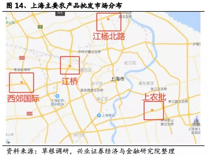 我们实地调研了上海的主要农产品批发市场西郊国际(主打水果)、江桥市场(主打蔬菜)、江杨北路市场(主打水产品)和上海农产品批发市场。虽然没有明确的分级,但根据调研情况看西郊国际、江桥、江杨北路市场的商贩一般来自农产品产地,为上海的一级批发市场;上海农产品批发市场的商品有较大比例来自前三个批发市场(也有部分产地直供),从价格上比价也普遍高于其他批发市场,可以定义为满足浦东商品需求的上海二级批发市场。