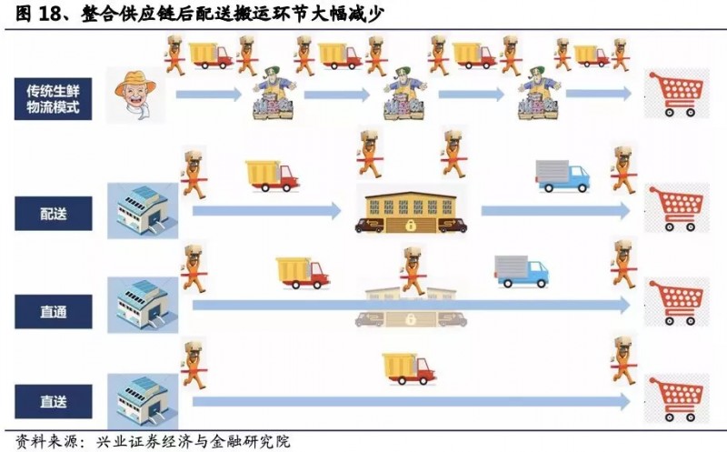 传统生鲜物流模式下,商品需经过至少三级转运——产地集贸市场/农产品收集者+产地批发商+销地批发商,其中涉及搬运次数至少8次;企业整合供应链后,配送模式基本分为三种: