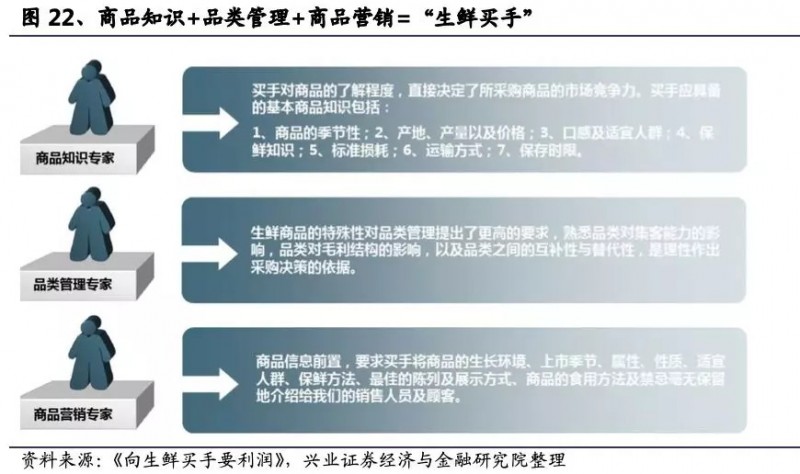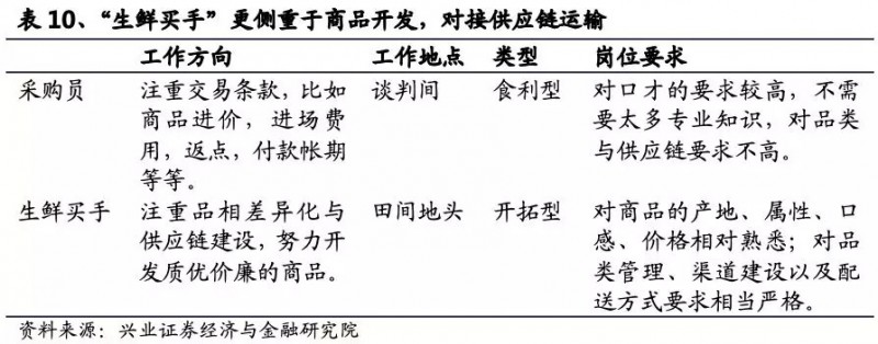 与“买手”相比,生鲜采购员则更注重交易条款,比如商品进价,进场费用,返点,付款帐期等等;而“买手”更注重品相差异化与供应链建设,努力发开质优价廉的商品。“买手”对商品的了解程度,直接决定了所采购商品的市场竞争力。“买手”作为供应链环节第一环,向上面对广泛农户,要求掌握当地农产品资源,克服地方保护主义,了解当地农产品生产周期与季节规律,对农产品品种质量有必要的鉴别能力,对相应产地的产量和价格波动敏感;向下面对物流运输及需求终端,要求其精通农产品营销渠道,品类管理相当熟悉,能合理安排生产、收获及转运计划。