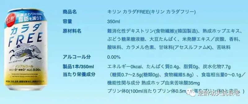 「麒麟Kirin Body FREE」官方提供的资料里,提到了一些特殊原料,例如:熟成啤酒花提取物、难消化性糊精(膳食纤维)、葡萄糖、大豆蛋白、大米发酵提取物/碳酸、香精、酸化剂、焦糖色素、甜味剂(乙酰磺胺酸钾)、苦味剂。