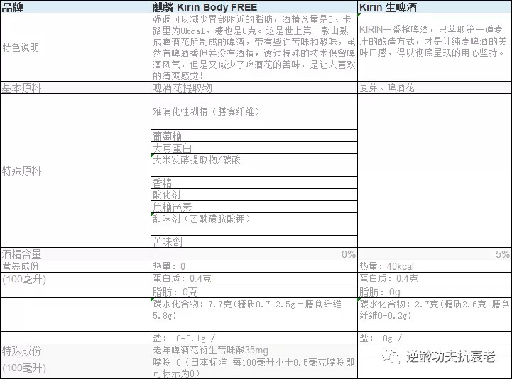 「麒麟 Kirin Body FREE」及畅销款「KIRIN一番榨啤酒」在原料及营养成份上的差异。「KIRIN生啤酒」是一款常规合成风味啤酒