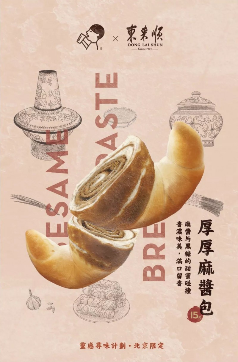 灵感寻味计划北京站,联手中华老字号“东来顺”推出京味十足的「厚厚麻酱包」。以独创的日式软面团做成层层起酥状,厚厚的黑糖麻酱包裹住软嫩的薄面,呈现传统工艺带来的美好味道。
