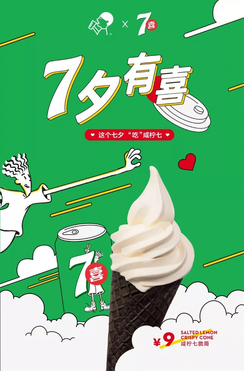 2019年七夕,喜茶和7喜,双喜联名,以“7夕有喜”为主题,灵感制冰,取咸柠檬的酸咸元素,在雪糕中融入陈皮和柠檬味7喜,推出了「咸柠七脆筒」,让人眼前一亮。